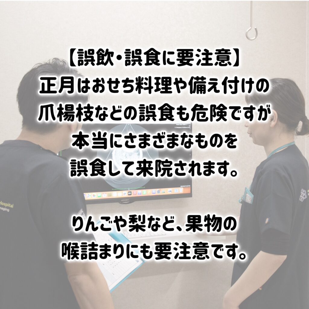 正月はおせち料理や備え付けの爪楊枝などの誤食も危険ですが、本当にさまざまなものを誤食して来院されます。りんごや梨の喉詰まりにも要注意です。