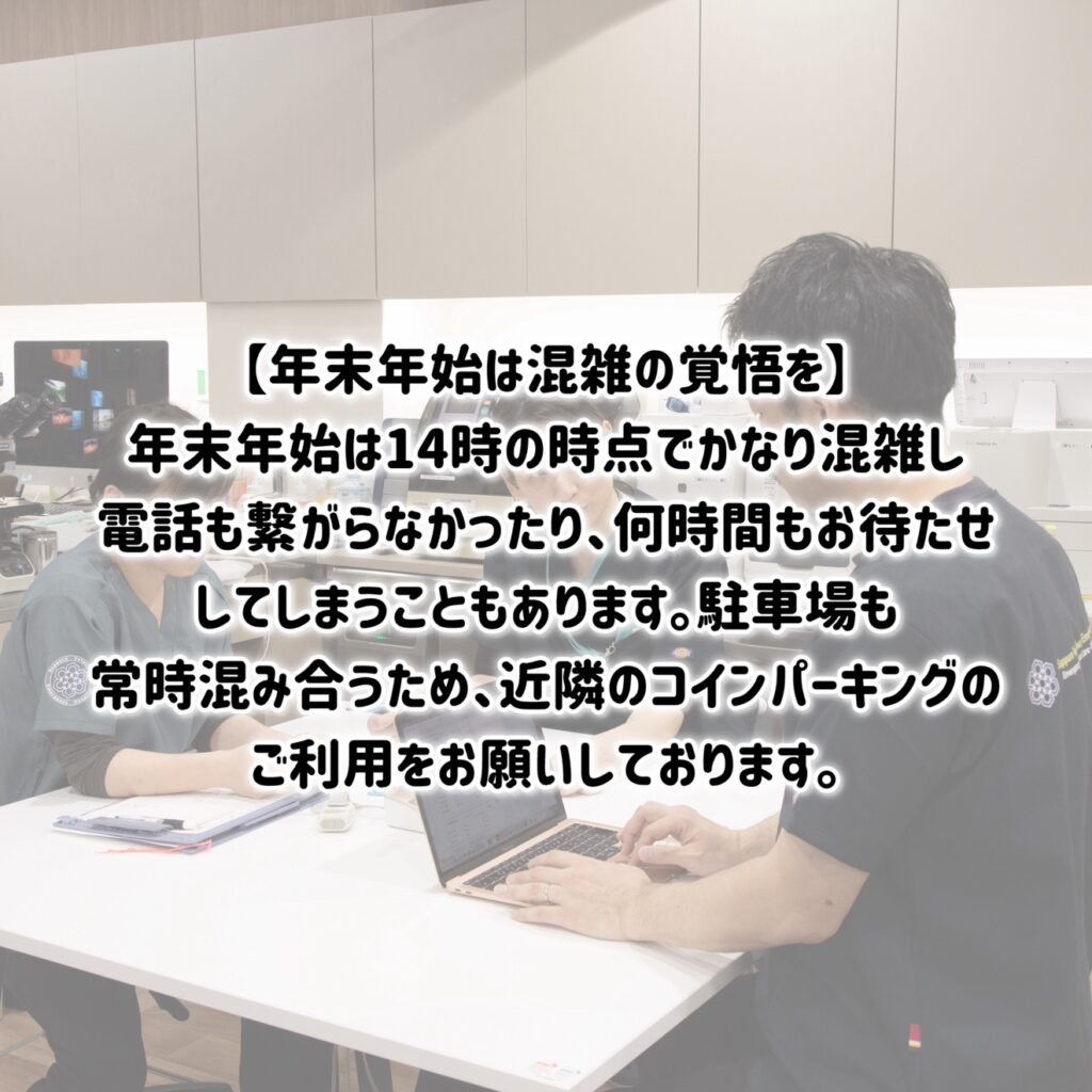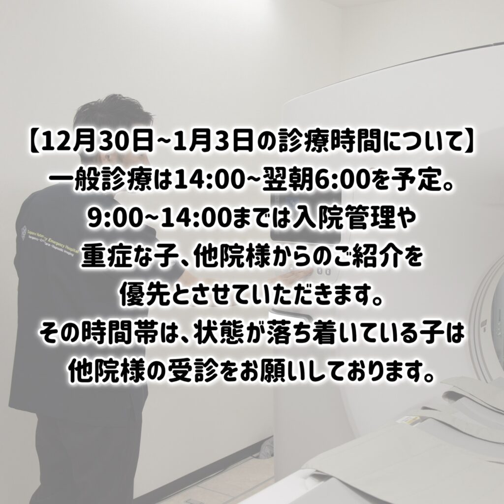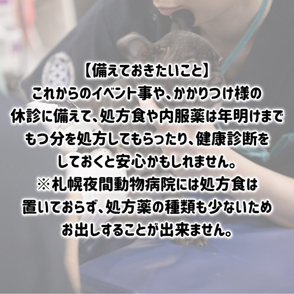 イベント事や、かかりつけ様の休診に備えて、処方食や内服薬は年明けまでもつ分を処方してもらったり、健康診断をしておくと安心かもしれません。当院には処方食は置いておらず、処方薬の種類も少ないため、お出しすることが出来ません。