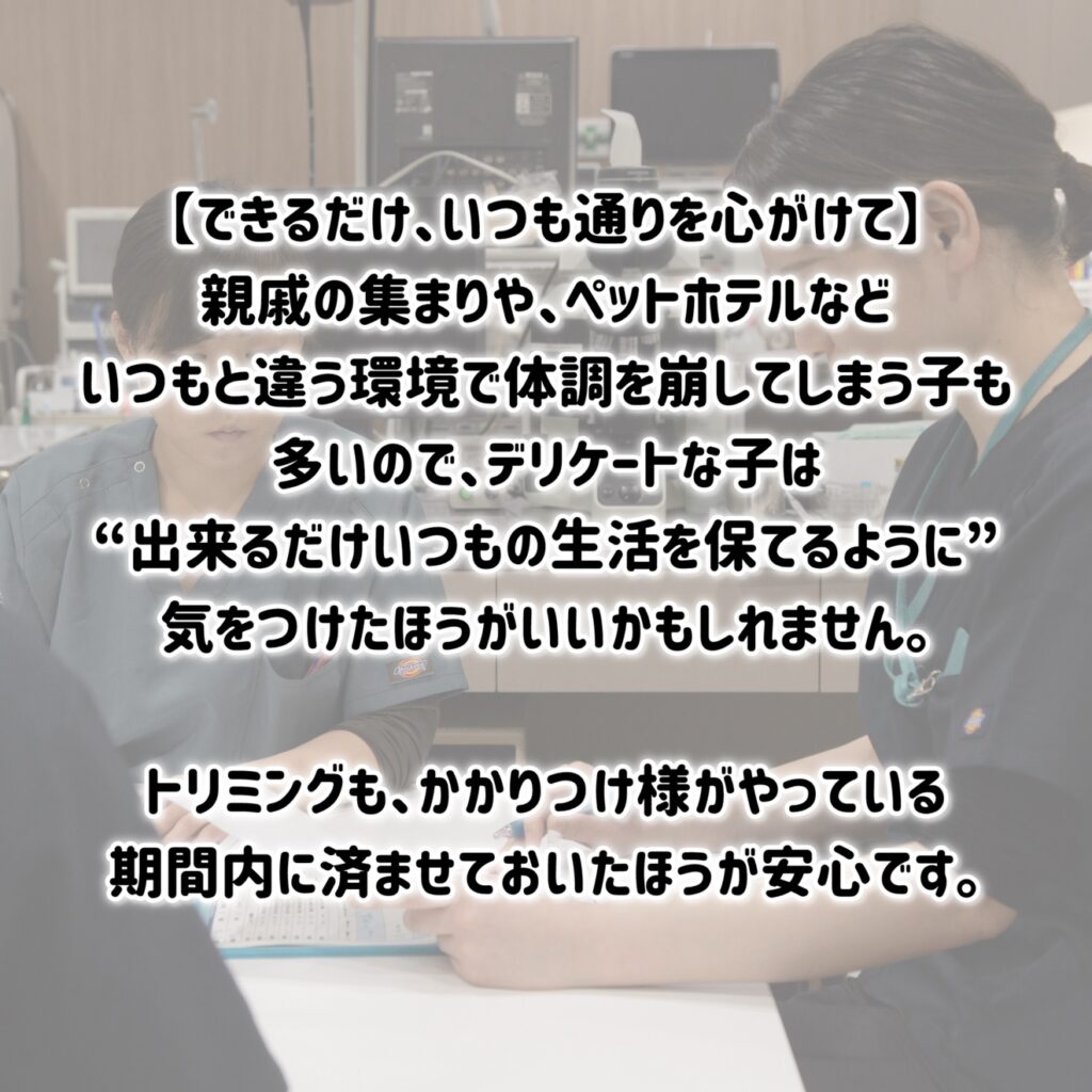 また、親戚の集まりや、ペットホテルなど、いつもと違う環境で体調を崩してしまう子も多いので、デリケートな子は“出来るだけいつもの生活を保てるように”気をつけたほうがいいかもしれません。トリミングなども、かかりつけ様がやっている期間内に済ませておいたほうが安心です。