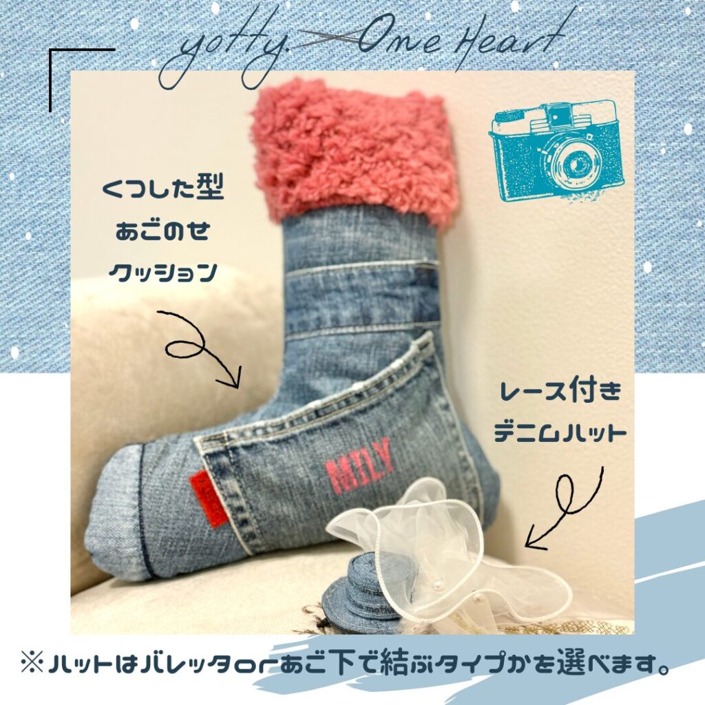 今年の参加者ギフトは、クリスマス感たっぷりな「デニムハット〜レース付き〜」&「くつした型あごのせクッション」のセットです。